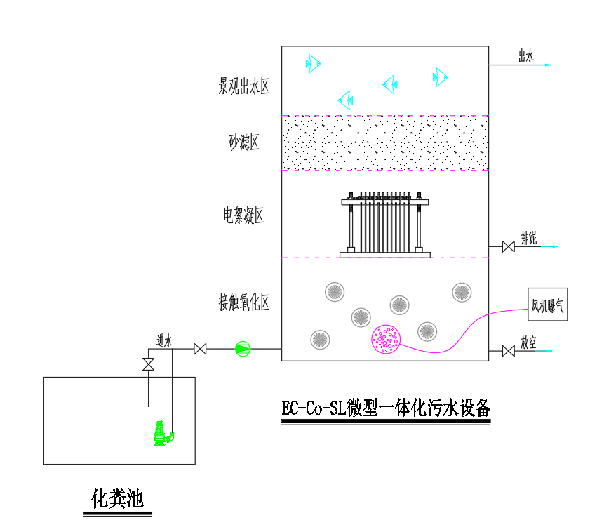 農(nóng)戶家用污水排放至三級化糞池,經(jīng)過初步水解與沉淀,雜物沉入池內(nèi),定期清掏;清液則由污水提升泵抽入一體化設(shè)備內(nèi)進行凈化處理。在一體化設(shè)備內(nèi)污水通過導(dǎo)流筒首先進入接觸氧化區(qū),該區(qū)域內(nèi)有曝氣系統(tǒng)及懸浮填料供微生物附著,在好氧微生物的作用下,降解水中主要污染物COD、BOD及將氨氮轉(zhuǎn)化為硝態(tài)氮。后經(jīng)過電催化絮凝,去除水中的污染物及磷,再通過砂濾的過濾作用下,使出水得到進一步凈化,水在通過砂濾區(qū)時因沒有曝氣的原因會形成缺氧狀態(tài),并在砂濾區(qū)微生物的作用下使硝態(tài)氮轉(zhuǎn)化為氮氣達到脫氮的作用。最后水會進入景觀出水區(qū),在景觀出水區(qū)內(nèi)利用接觸氧化區(qū)溢出的氧氣使出水溶氧再次提高,符合排放要求。
