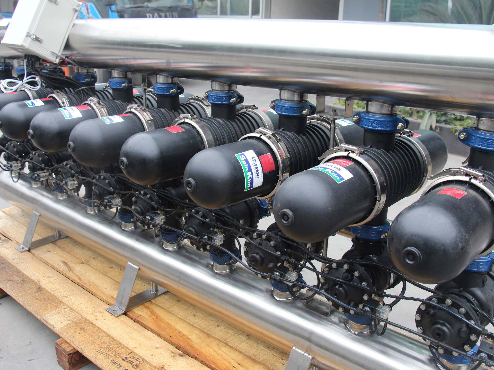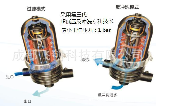 自動反沖洗過濾器是疊片式過濾器的優(yōu)點的進一步發(fā)揮,和一般疊片式過濾器的不同之出是在于它的專利設(shè)計的內(nèi)撐,一體式內(nèi)撐上有一組彈簧,一個活塞,和三組反沖噴嘴,他們配合其他控制系統(tǒng)共同作用達到高效過濾和完全反沖的功效。